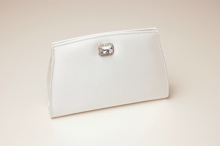 White silk satin clutch style handbag with Swarowski crystal and detachable fabric strap.