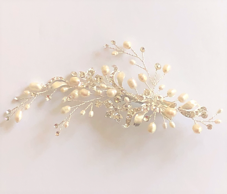5" Comb of rhinestone florals and leaves and freshwater pearls.