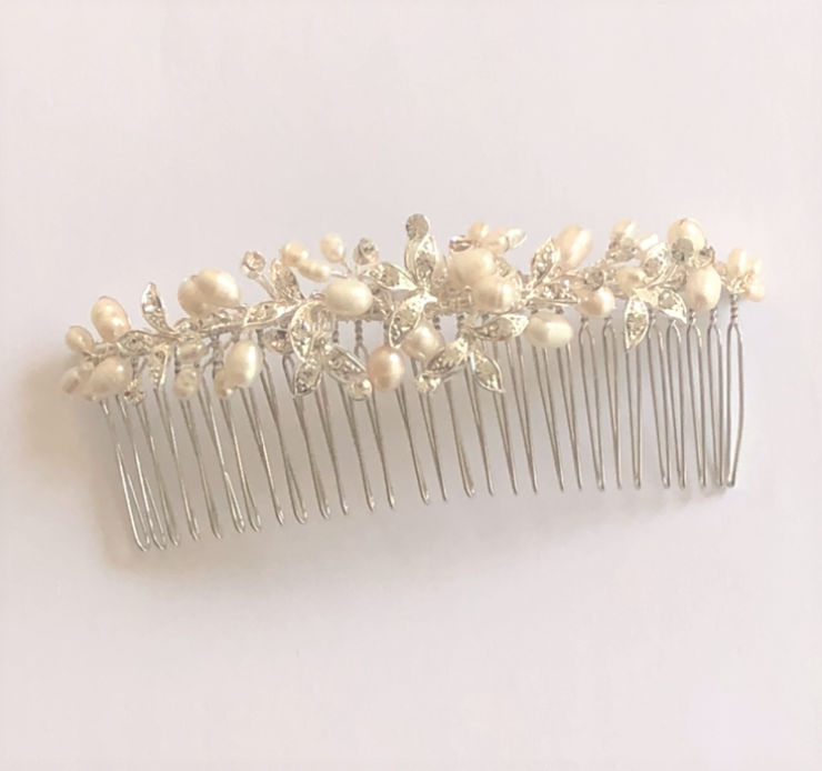 4 1/2" Comb of freshwater pearls and metal rhinestone leaves.