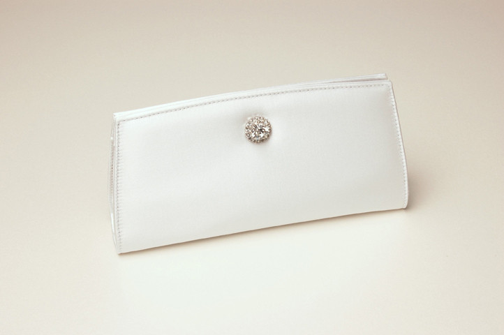 White silk satin clutch style handbag with round Swarowski crystal and fabric strap.