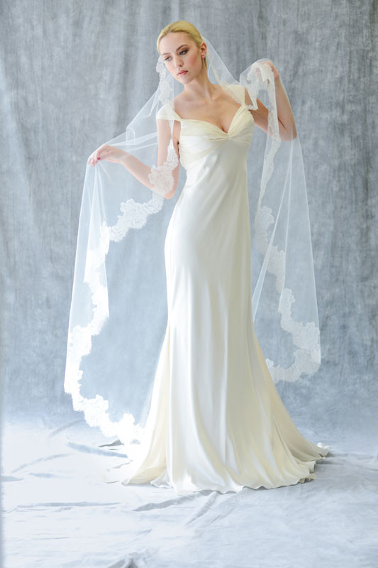 72″ long (72″) mantilla with 2″ wide Chantilly lace edge that graduates to 4 1/2″ scallop Chantilly lace on a wire comb at top of veil. (Diamond white, ivory or white)