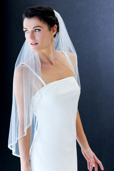 35″ (72″) with a 1/4″ wide beaded edge of sequins, clear & silver beads and crystals on a wire comb. (Diamond white, ivory or white)