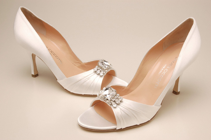 This stunning draped toe sandal is accented with an expressive imperial Swarovski crystal brooch and secured with a form fitting heel.