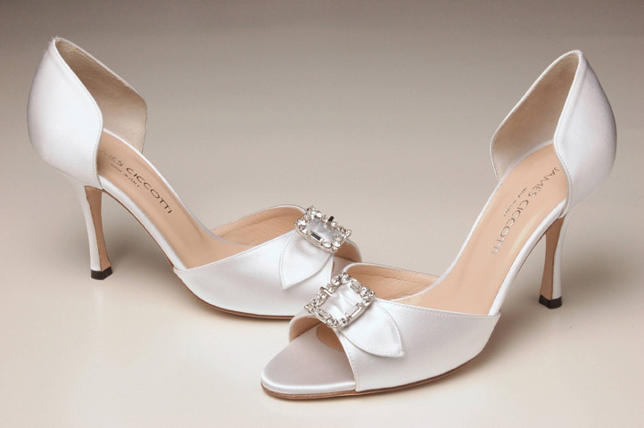 A sophisticated emerald cut Swarovski crystal buckle is the focus of attention on this romantic peep toe with curved stiletto heel.